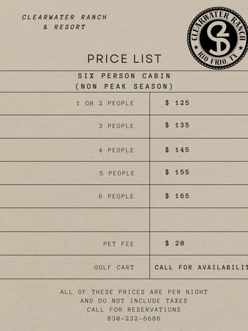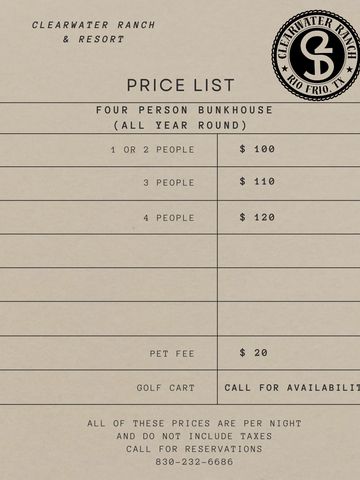 Please Call to Reserve your Cabin or Bunkhouse. (830) 232-6686